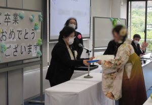 本式終了後、教室に移動し看護学部の学生1人1人に教員から学位記を授与しました。
